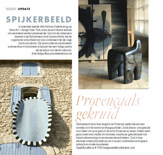 Jordi Sarrate's Indigo Blue Stool from Mia Karlova Galerie featured in the March 2025 issue of Elle Decoration NL.